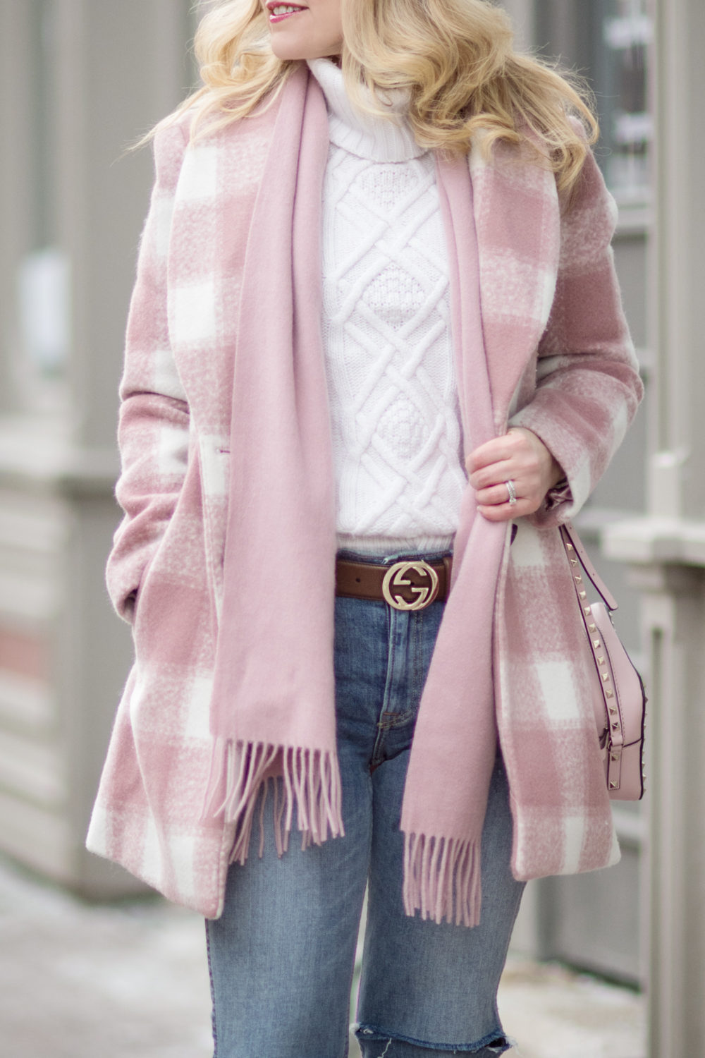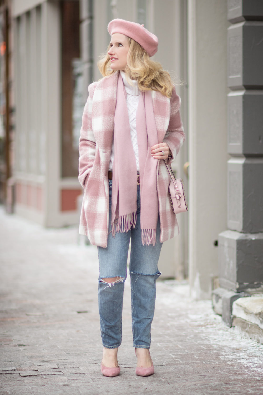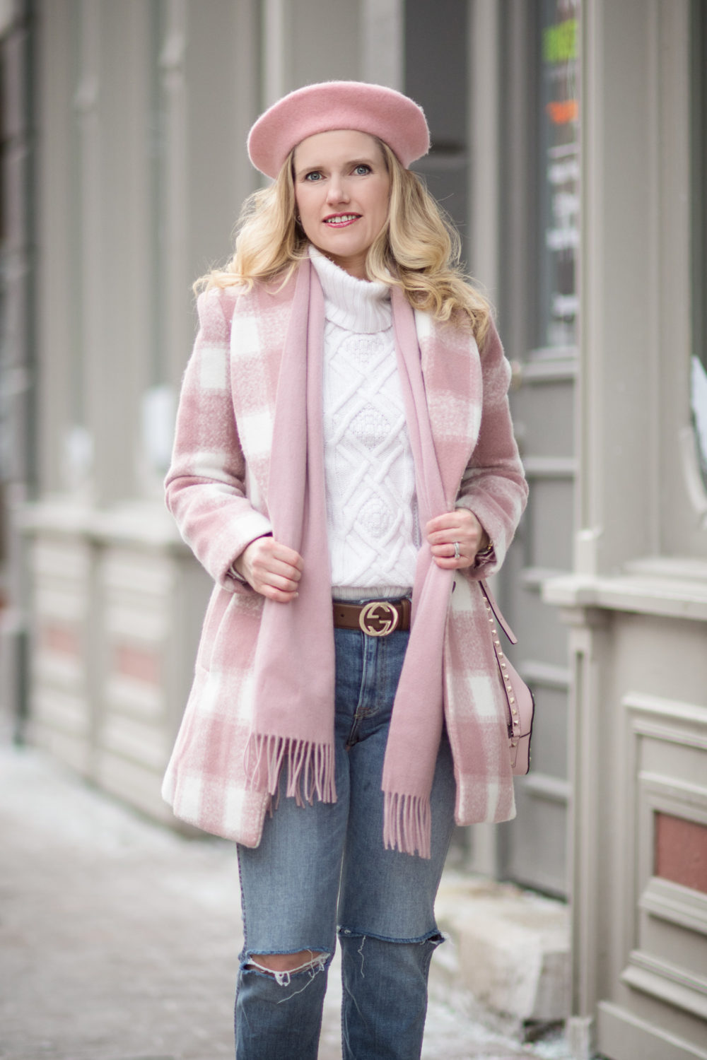 Endless Rose Oversized Checkered Jacket (identical here on sale!) | J. Crew Cambridge Turtleneck (old – similar here and here) | GRLFRND Petite Naomi High Rise Jean | Gucci Leather Belt with Interlocking G | Cuddle Dreams Cashmere-Wool Scarf | ZLYC Classic Wool Beret | Valentino Rockstud Crossbody Bag (less expensive option here) | H&M Pumps (old – similar here) | Urban Decay Lipstick (Rejected)