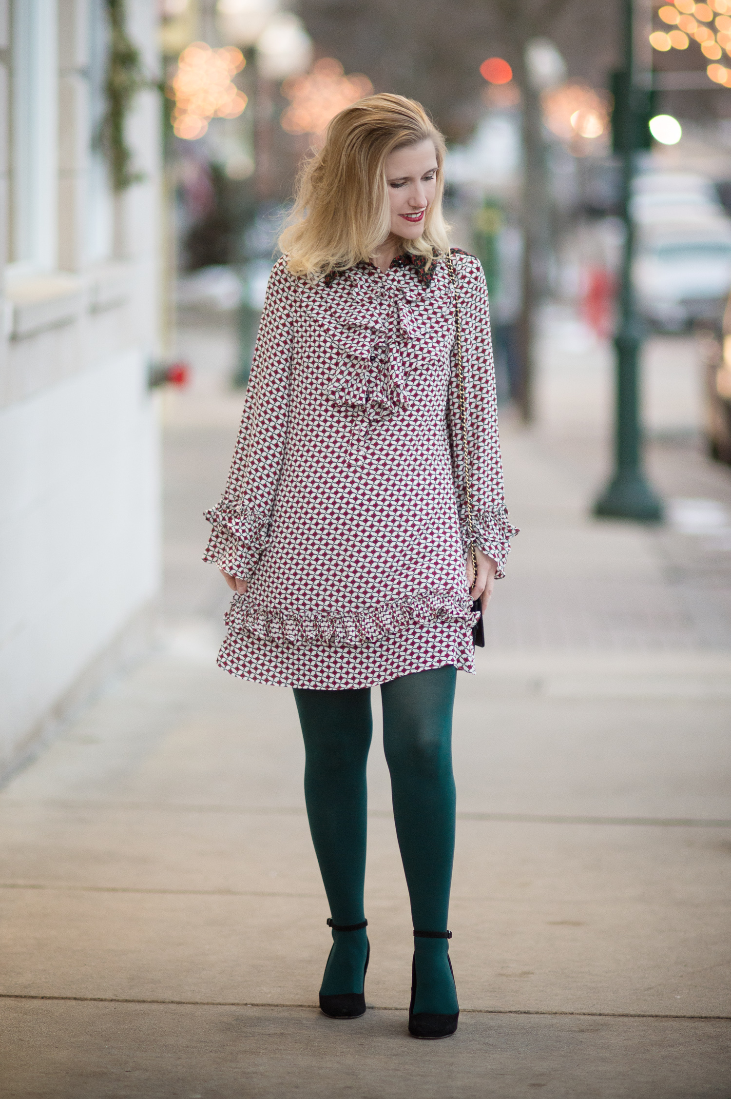 This dress could really be worn any time during the fall and winter. But by adding these colorful green opaque tights by HUE a fun and festive holiday look is created. Nothing says more than the combination of red and green in an outfit for a holiday celebration!