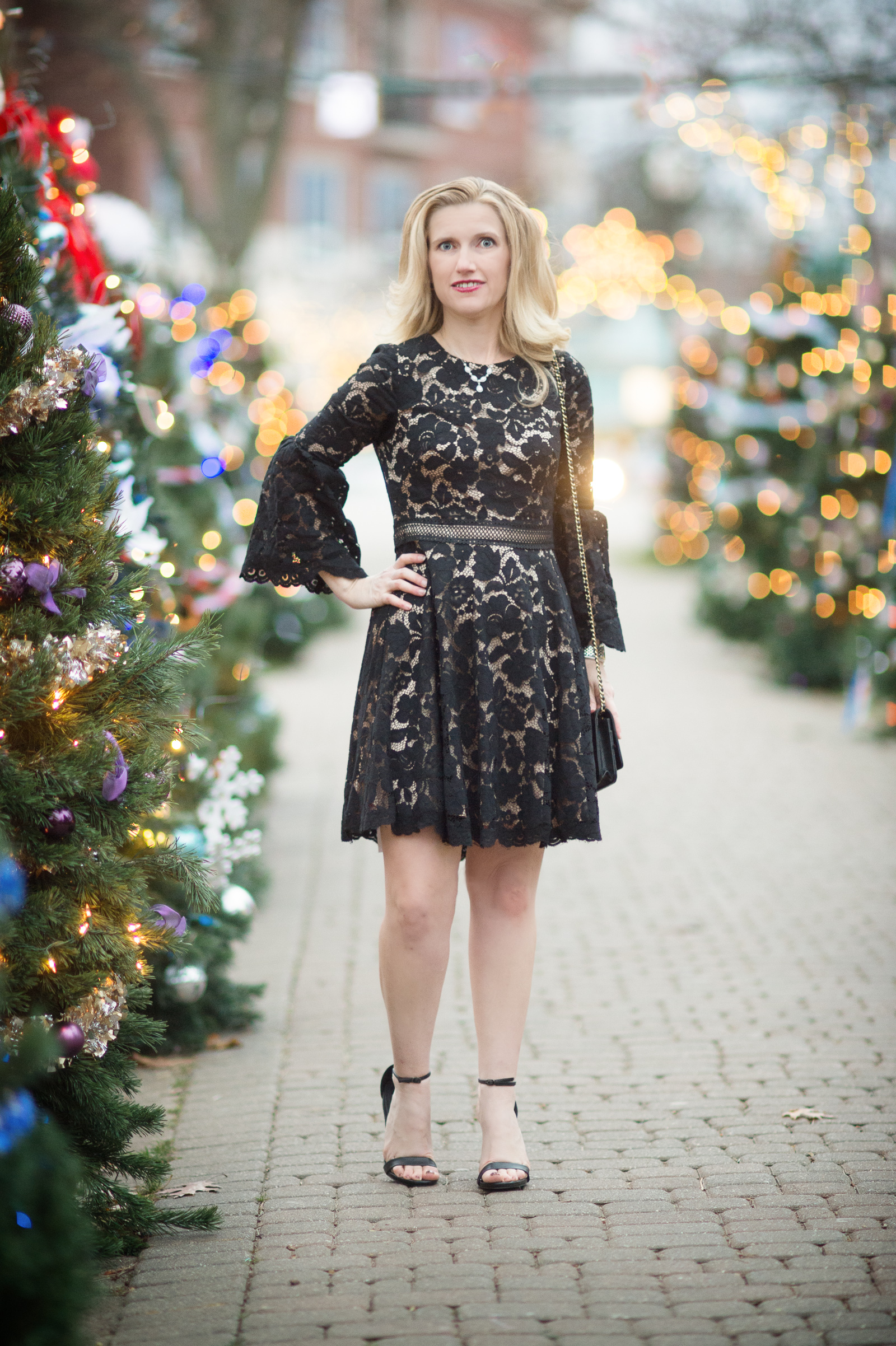If you follow my blog at all, you know that I love just about everything lace. When I saw this pretty Vince Camuto lace dress at Macy’s, I knew it was the dress for me! This dress is so classic and timeless, that it is perfect for the holidays and beyond. The fit and flare styling is perfect for my petite frame. The bell sleeves add such an elegant touch as well.